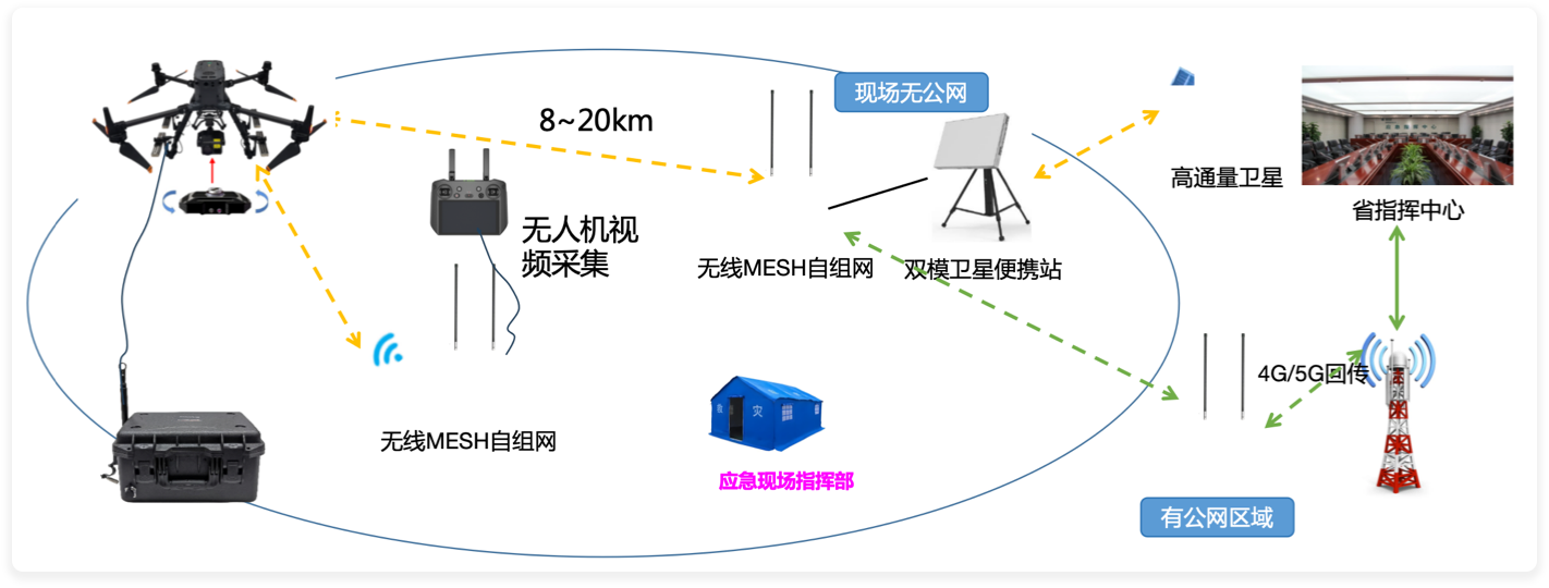 可基于大疆系列无人机或系列照明无人机直接挂载机载版无线宽带MESH自组网设备,将通信覆盖半径由3~7km,提升到8~20km,可适应用于山区山上山下,或远距离拉距应用。