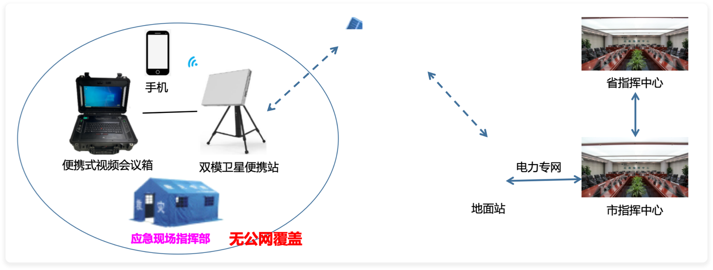 视频会商:在现场指挥部部署便携式一体化视频会议箱,通过双模卫星便携站专网卫星通道,实现与后方指挥中心之间的专网视频会商。互联网模式下,手机通过腾讯会议或者微信实现视频会商。